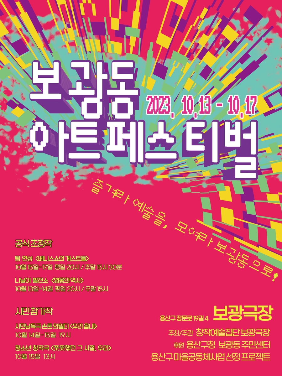 10월 13∼17일 용산구 보광극장에서는 시민 참여형 축제 '보광동 아트페스티벌'이 관객을 만난다. 연극을 매개로 지역주민과 예술가가 교류하고 소통하는 자리다.