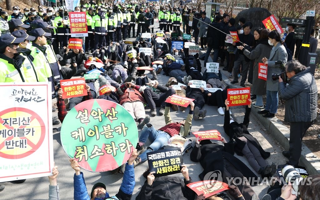 | ▲ '설악산 케이블카 반대' 드러누운 환경단체 (광주=연합뉴스) 천정인 기자 = 3일 오후 제3회 국립공원의 날 기념식이 열린 광주 동구 무등산국립공원에서 환경단체 관계자들이 설악산 오색 케이블카 설치를 허가한 환경부를 규탄하며 행사장 출입구 앞 도로에 누워있다. 2023.3.3 iny@yna.co.kr |