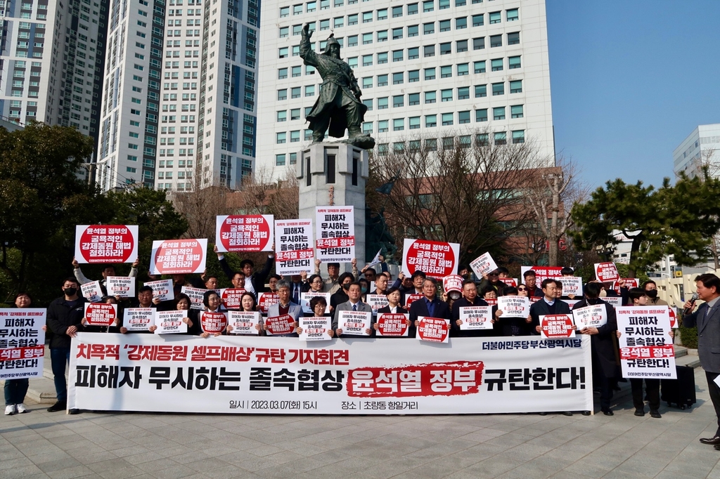 (부산=연합뉴스) 오수희 기자 = 더불어민주당 부산시당은 7일 "윤석열 대통령은 일제 강제 동원 피해자들이 인정하지 않고, 국민이 동의하지 않는 대일 구걸 외교를 당장 중단해야 한다"고 밝혔다.