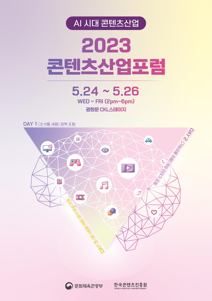 문화체육관광부와 한국콘텐츠진흥원은 'AI 시대, 콘텐츠산업'을 주제로 24~26일 서울 중구 CKL스테이지에서 '2023 콘텐츠산업포럼'을 개최한다고 22일 밝혔다.