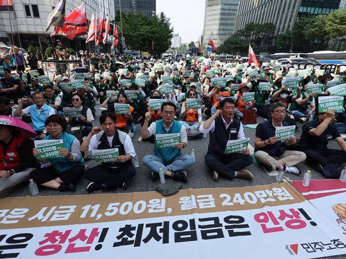 Members of the Korean Confederation of Trade Unions stage a rally in Seoul on June 18, 2025, to declare their campaign to seek an increase in the minimum wage. Representatives of employers, workers and the government are set to hold the sixth plenary session of the minimum wage committee the next day to set next year's minimum hourly wage. (Yonhap)