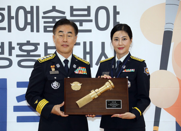 South Korean singer Solbi (R) poses for a photo during a ceremony in Seoul on July 29, 2024, to mark her appointment as a promotional ambassador for the National Fire Agency. (Yonhap)