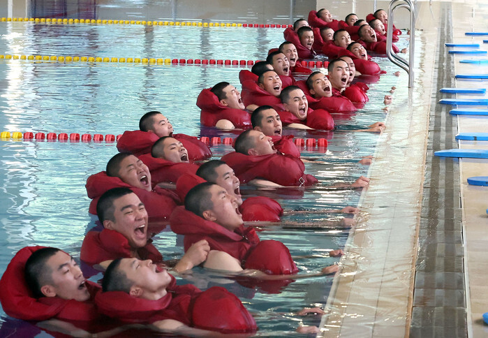 Sailor recruits take part in a combat swimming drill at a training pool at the Navy's boot camp in the southeastern city of Changwon on July 16, 2025, as the 715th batch of Navy recruits undergo their four-week basic military training. (Yonhap)