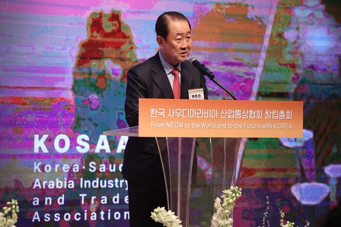 Park Joo-sun, head of the Korea Petroleum Association, delivers a speech during an inaugural meeting of the South Korea-Saudi Arabia Industry and Trade Association at the Press Center in Seoul on March 5, 2024. (Yonhap)