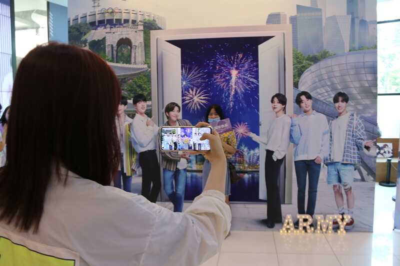 A Chinese fan of K-pop superstar BTS takes a photo of the septet's poster at the BTS Festival that was hosted by the Korean Cultural Center in Beijing on June 6, 2021. (Yonhap)