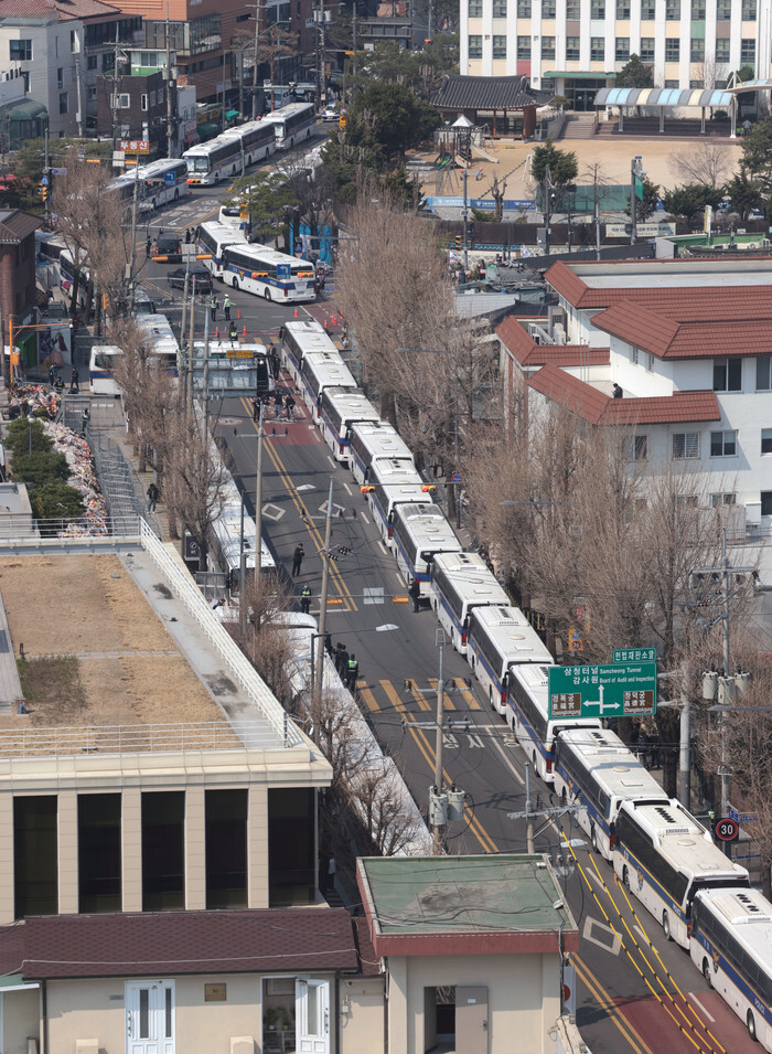 Barricades of police buses are set up near the Constitutional Court in central Seoul on April 1, 2025, after the court said it will hand down a decision at 11 a.m. on April 4 on whether to remove impeached President Yoon Suk Yeol from office or reinstate him over his brief imposition of martial law in early December. (Yonhap)
