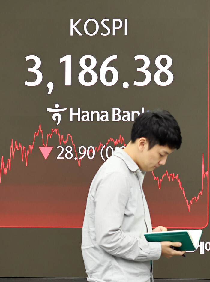 A financial data screen in the dealing room of Hana Bank in Seoul on July 16, 2025, shows the benchmark Korea Composite Stock Price Index having fallen 28.90 points, or 0.90 percent, to close at 3,186.38. Seoul shares closed lower as weaker-than-expected U.S. inflation data prompted investors to trim their bets on the Federal Reserve's rate cuts. (Yonhap)