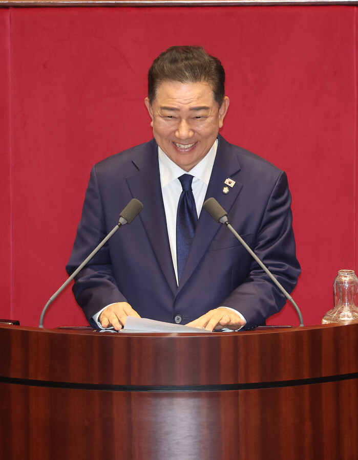 Kim Byung-kee, a lawmaker of the ruling Democratic Party, speaks after being elected as the chief of the house steering committee during a plenary session at the National Assembly in Seoul on June 27, 2025. (Yonhap)