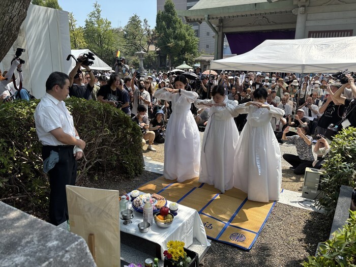 Mourners give a deep bow during an annual memorial service at Yokoamicho Park in Tokyo on Sept. 1, 2025, to pay tribute to Koreans massacred by Japanese in the aftermath of the 1923 Great Kanto Earthquake in Tokyo and its vicinity. The massacre of some 6,000 Koreans began when the Japanese government spread rumors of a planned riot by Koreans in a scheme to divert public attention from social unrest. (Yonhap)