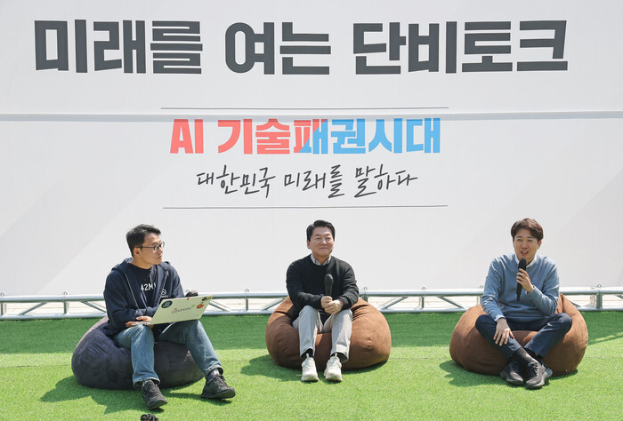 Lawmaker Ahn Cheol-soo (C), a contender in the conservative People Power Party's primary for the June 3 presidential election, and Lee Jun-seok (R), the minor New Reform Party's candidate for the election, attend a talk show on artificial intelligence in Seongnam, south of Seoul, on April 25, 2025. (Yonhap)