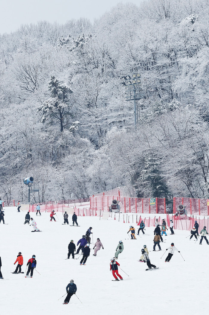 Visitors at a ski resort in Gwangju, Gyeonggi Province, enjoy winter by skiing and snowboarding on Dec. 14, 2025. (Yonhap)
