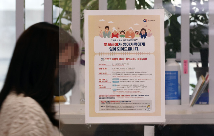 A notice on the payment of monthly benefits to parents with infants aged 0-1 is posted on a community service center in Seoul on Jan. 25, 2023. The government introduced the "parental pay" to support such parents and encourage child births amid the country's low birthrate. Parents with children aged 0 and 1 receive 700,000 won (US$568.18) and 300,000 won per month, respectively. The pay will increase to 1 million won and 500,000 won next year, respectively. (Yonhap)