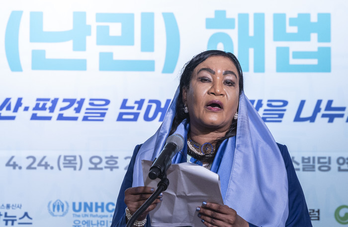 Sudanese Ambassador to South Korea Amira Agarib speaks at the headquarters of Yonhap News Agency in Seoul on April 24, 2025, during a global forum, co-hosted by Yonhap and the United Nations High Commissioner for Refugees to address the issue of forced displacement in Africa, where more than 100 million people have lost their homes due to war, violence or persecution. (Yonhap)