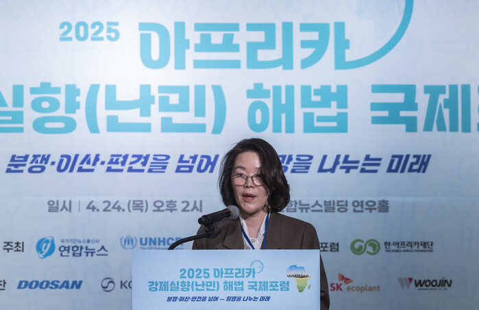 Kim Sae-ryeo, chief of the Korean office of the United Nations High Commissioner for Refugees (UNHCR), speaks at the headquarters of Yonhap News Agency in Seoul on April 24, 2025, during a global forum, co-hosted by Yonhap and the UNHCR to address the issue of forced displacement in Africa, where more than 100 million people have lost their homes due to war, violence or persecution. (Yonhap)
