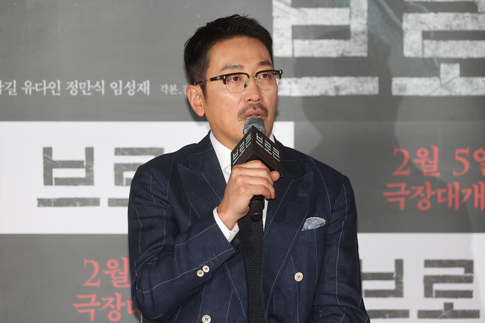 South Korean actor Ha Jung-woo, who stars in the new movie "Nocturnal," responds to reporters' questions during an event in Seoul on Jan. 23, 2025, to promote the movie, set to hit local screens in South Korea on Feb. 5. (Yonhap)