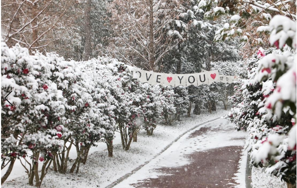 5ha 부지에 심어진 애기동백 1만7천그루, 꽃 2천4만송이가 하얀 눈에 뒤덮여 장관을 연출했다.