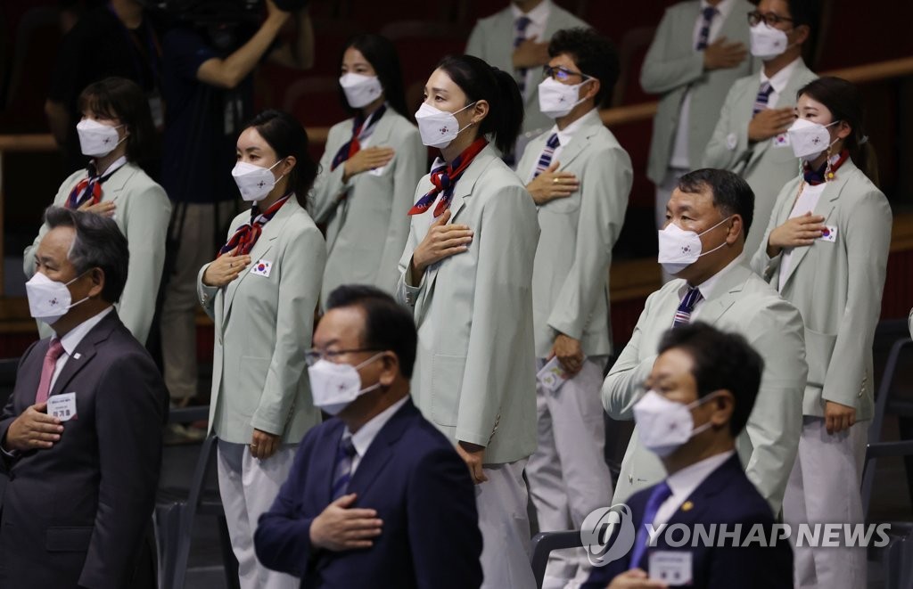 ▲ South Korean volleyball player Kim Yeon-koung (C) stands for the national anthem during the launching ceremony for the South Korean delegation for the Tokyo Olympics at the Olympic Park in Seoul on July 8, 2021. (Yonhap)