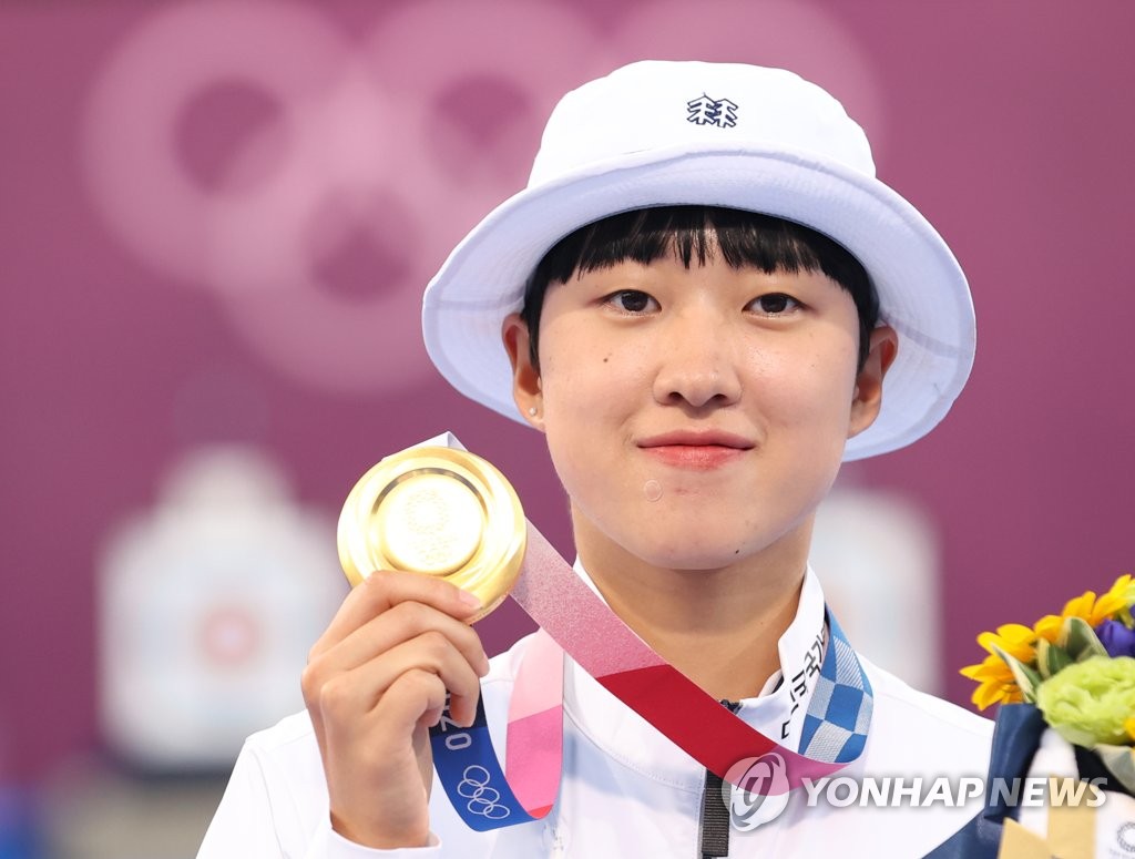 | ▲ An San of South Korea holds up her gold medal from the women's individual archery event at the Tokyo Olympics at Yumenoshima Park Archery Field in Tokyo on July 30, 2021. (Yonhap) |