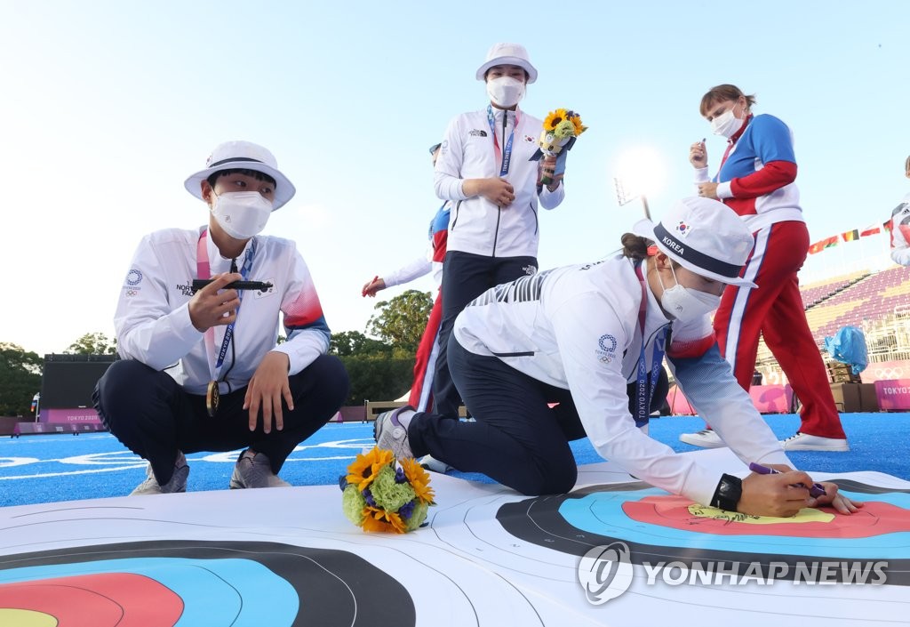 | ▲ Members of the South Korean women's archery team sign commemorative targets after winning gold medal at the Tokyo Olympics at Yumenoshima Park Archery Field in Tokyo on July 25, 2021. (Yonhap) |