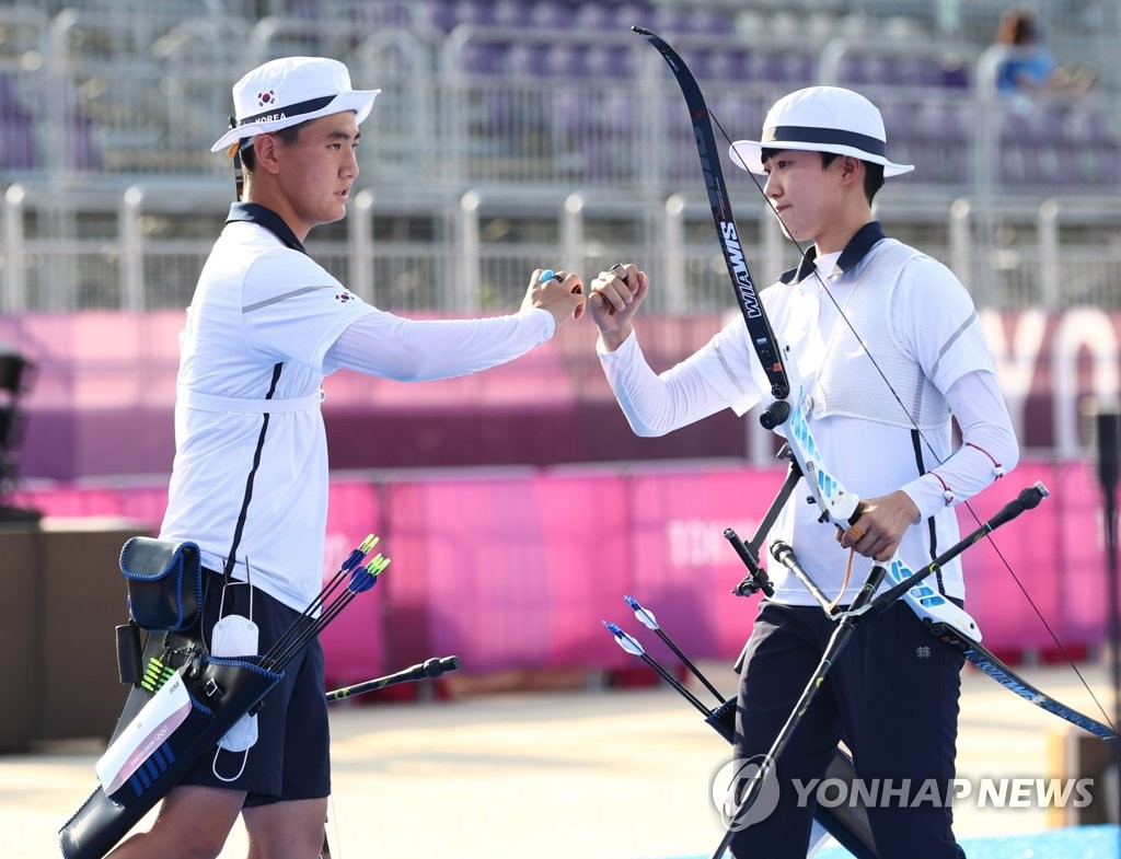 | ▲ South Korean archers Kim Je-deok (L) and An San bump fists during the final of the mixed team event at the Tokyo Olympics at Yumenoshima Park Archery Field in Tokyo on July 24, 2021. (Yonhap) |