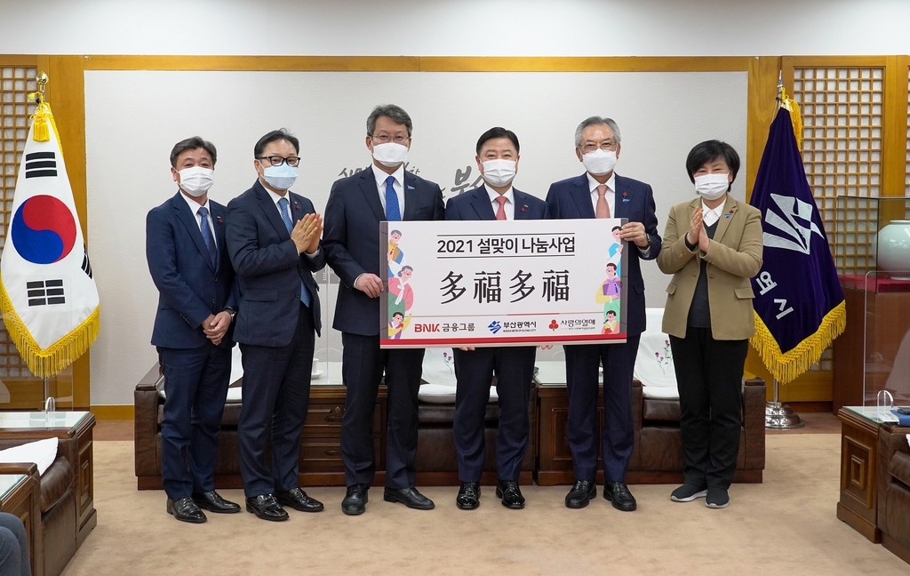 ▲ BNK금융은 19일 부산시청에서 부산시, 부산사회복지공동모금회와 함께 '2021 설맞이 다복다복 나눔 지원사업' 전달식을 열고 4억5천만원어치 복꾸러미를 기부했다. 명절 차림상 재료와 감염병 예방 키트 등 10여종 물품이 담긴 복꾸러미는 부산과 김해, 양산지역 주민자치센터를 통해 주민 9천 가구에 전달될 예정이다. BNK금융은 지역 소상공인을 돕기 위해 사회적 경제기업 물품으로 복꾸러미를 채웠다고 설명했다. (부산=연합뉴스)