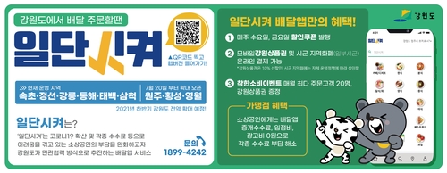 | ▲ 강원도형 민관 협력 배달앱 '일단시켜' 오픈 (원주=연합뉴스) 지역경제 활성화를 위한 강원도형 민관 협력 배달앱 '일단시켜' 서비스가 원주에서도 본격 운영된다. 사진은 홍보물. 2021.7.20 |