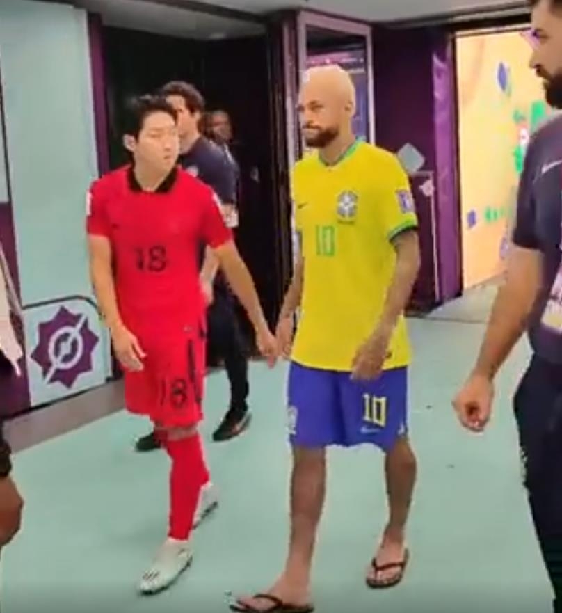 경기가 끝나고 슬리퍼로 갈아신은 네이마르는 기다리고 있던 이강인에게 악수를 청한 뒤 먼저 유니폼을 벗기 시작했다.