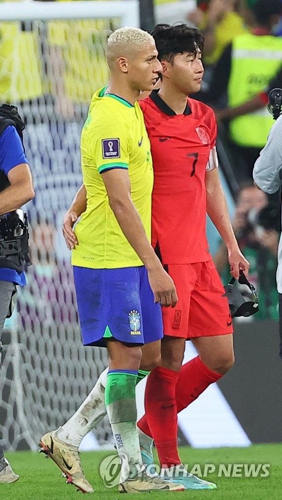 | ▲ 팀 동료끼리의 축하와 위로 (도하=연합뉴스) 김도훈 기자 = 6일(한국시간) 카타르 도하 974스타디움에서 열린 2022 카타르 월드컵 16강전 대한민국과 브라질의 경기가 끝난 뒤 잉글랜드 프리미어리그 토트넘 홋스퍼 소속 대표팀 손흥민과 브라질 히샤를리송이 축하와 위로의 인사를 나누고 있다. 2022.12.6 superdoo82@yna.co.kr |
