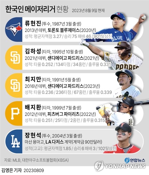 | ▲ [그래픽] 한국인 메이저리거 현황 (서울=연합뉴스) 김영은 기자 = 0eun@yna.co.kr 트위터 @yonhap_graphics 페이스북 tuney.kr/LeYN1 |