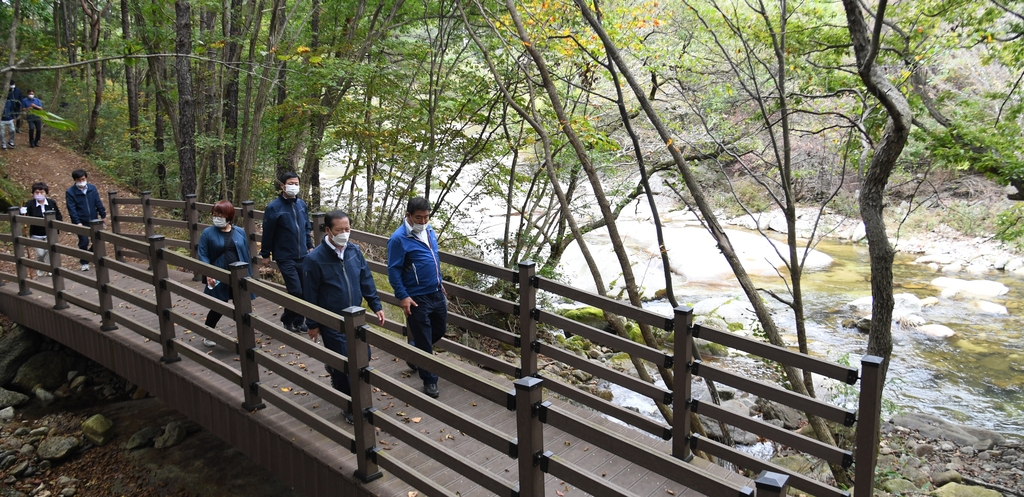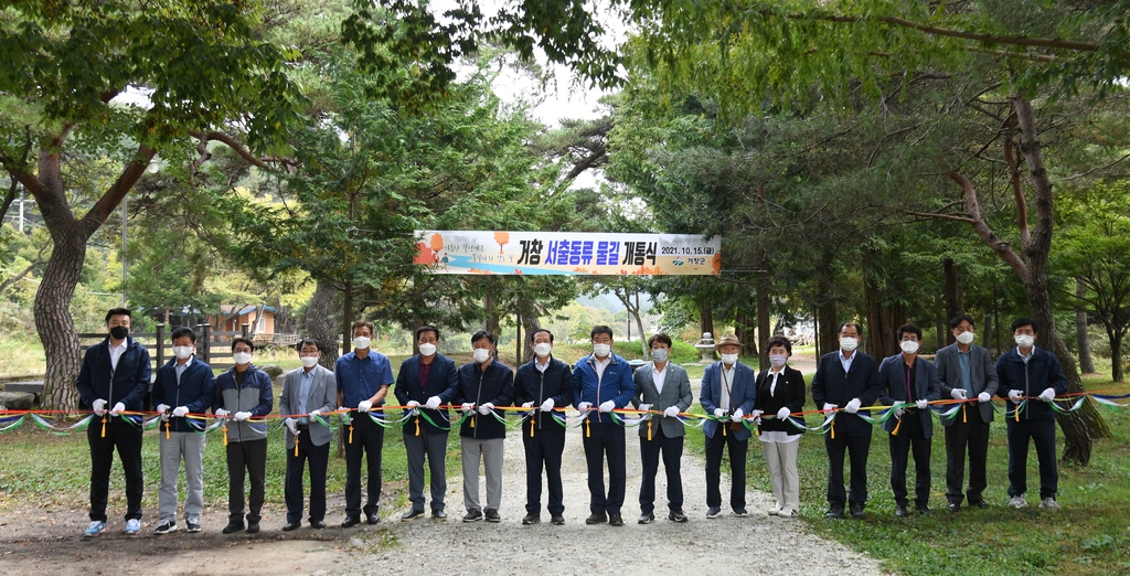 (거창=연합뉴스) 지성호 기자 = 경남 거창군은 15일 북상면 월성숲 일원에서 거창 서출동류 물길 트레킹코스를 개통했다.