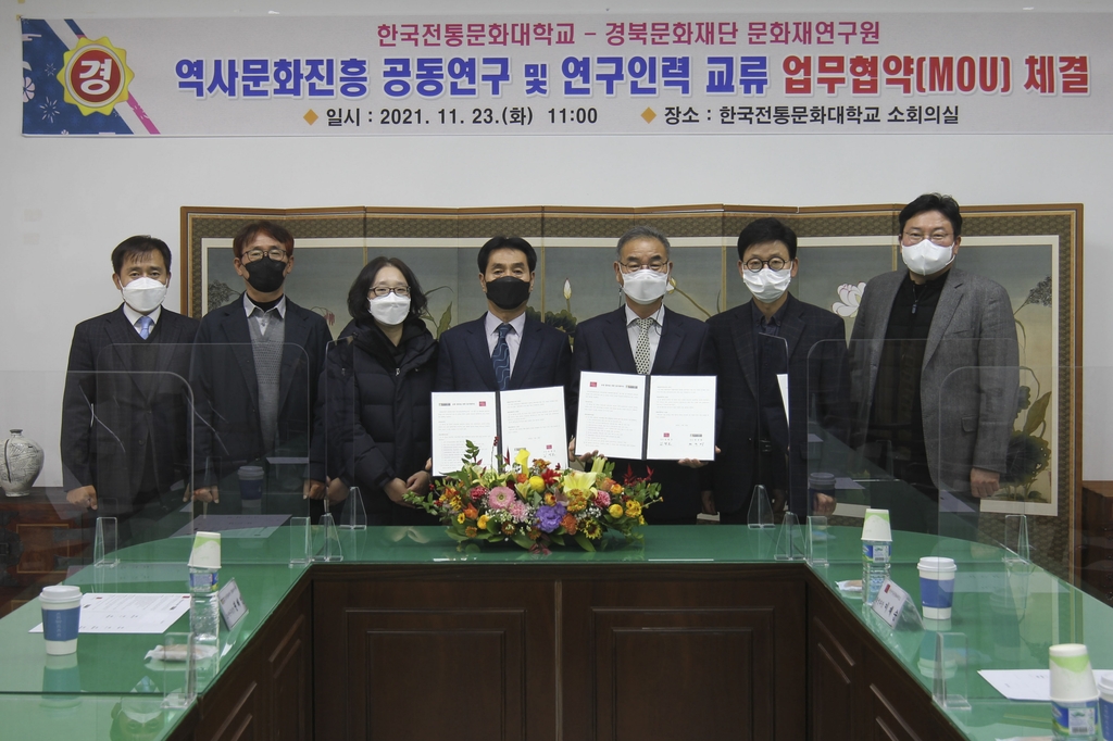 ▲ 한국전통문화대-경북문화재단 문화재연구원 협약 = 문화재청 한국전통문화대학교는 23일 학교 소회의실에서 경북문화재단 문화재연구원과 '전통문화 전문인력 양성과 지역 문화유산의 보존 및 진흥'을 위한 업무협약을 체결했다.