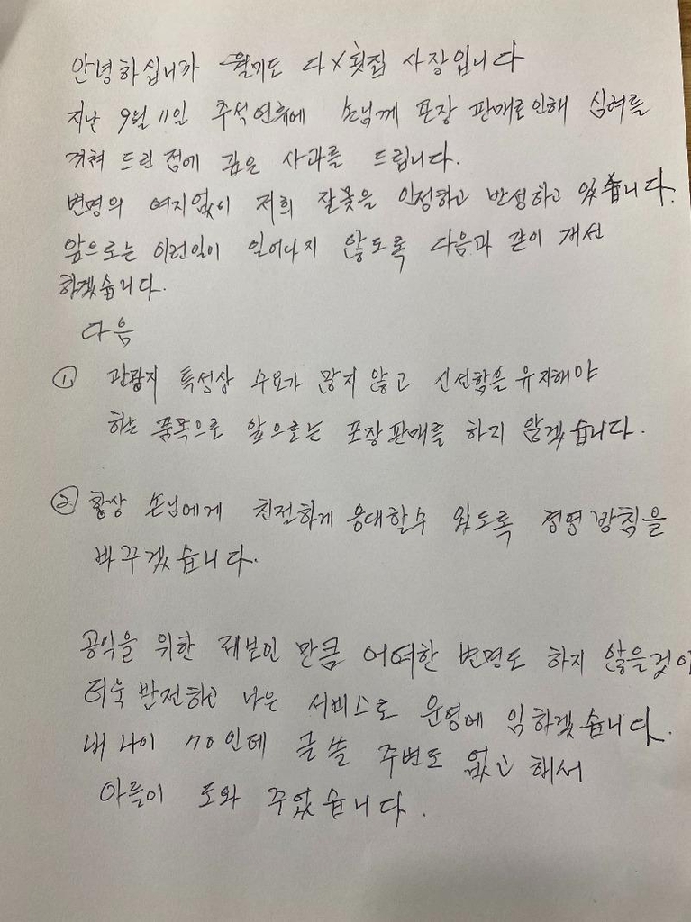 그는 사과문에서 "변명의 여지 없이 잘못을 인정하고 반성한다"며 "관광지 특성상 수요가 많지 않고 신선함을 유지해야 하는 품목으로 앞으로는 포장 판매를 하지 않겠다"고 잘못을 인정했다.
