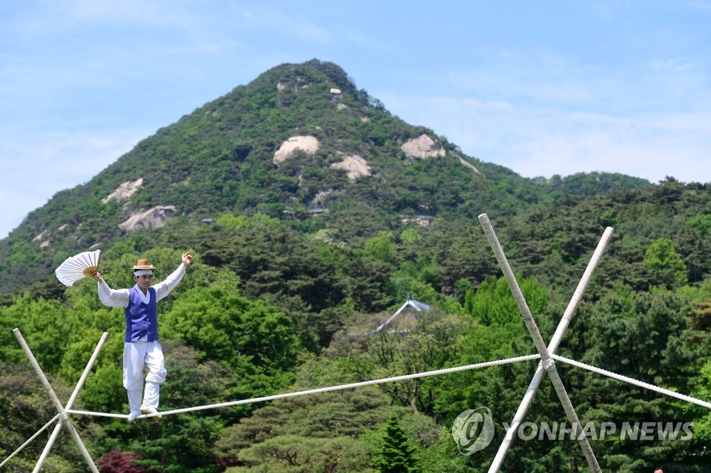 | ▲ 청와대 개방행사 '춘추관 줄타기' (서울=연합뉴스) 윤석열 정부 출범에 맞춰 청와대 국민 개방 기념행사가 열린 10일 서울 종로구 청와대 춘추관 앞에서 권연태 명인이 전통 줄타기 공연을 하고 있다. 2022.5.10 [인수위사진기자단] photo@yna.co.kr |