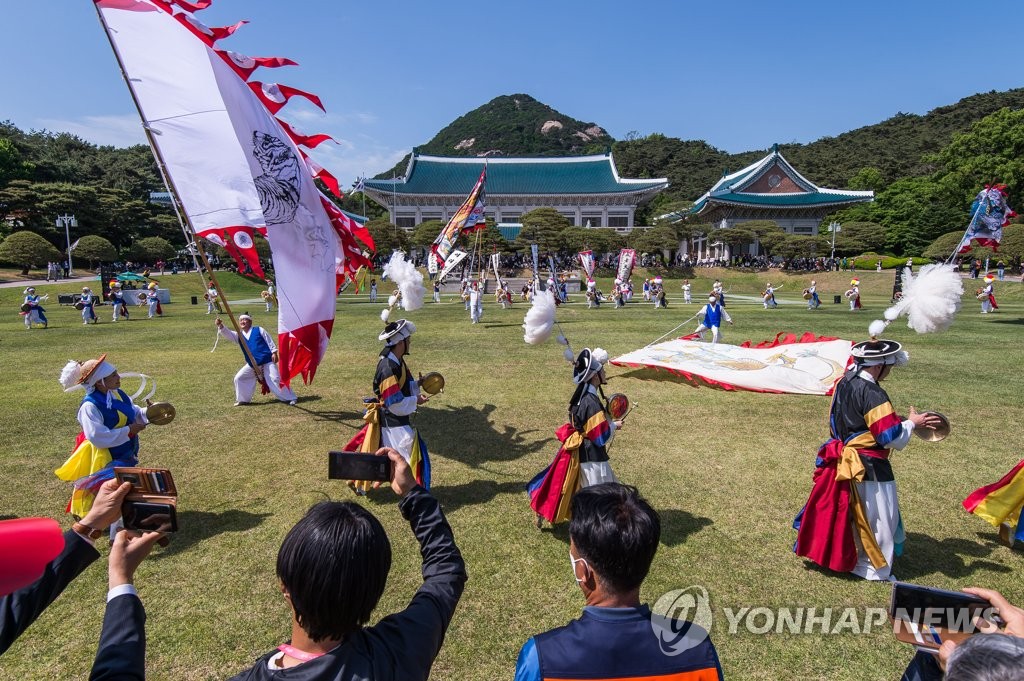 | ▲ 농악공연 열리는 청와대 대정원 (서울=연합뉴스) 10일 오후 서울 종로구 청와대 대정원에서 농악공연이 열리고 있다. 2022.5.10 [인수위사진기자단] photo@yna.co.kr |