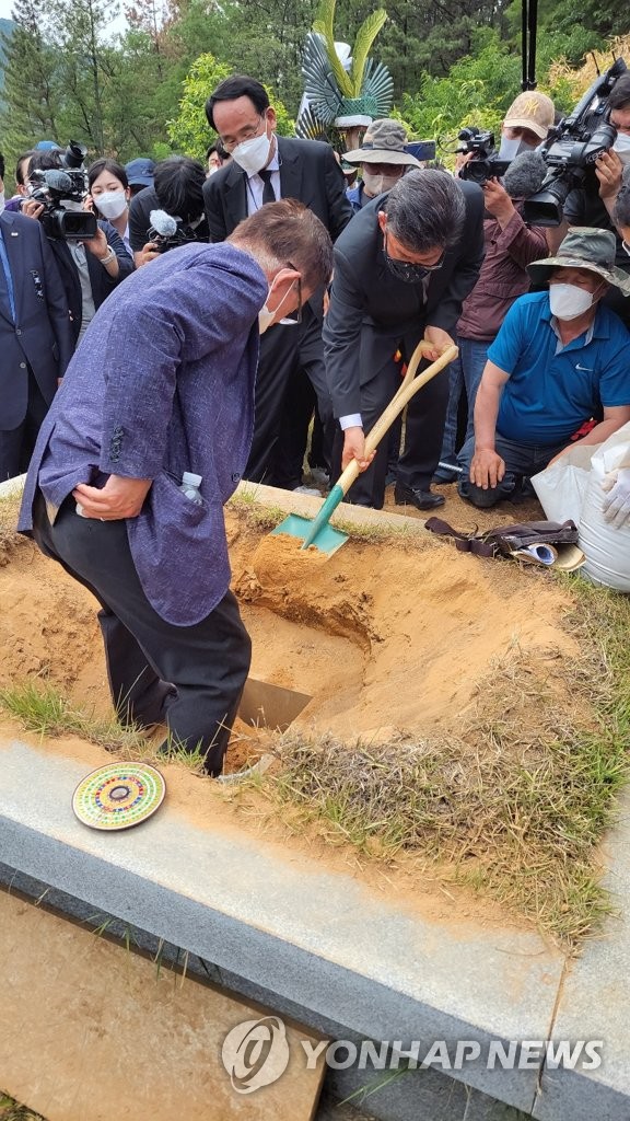 | ▲ "송해 선생님 편히 쉬십시오" (대구=연합뉴스) 김용민 기자 = 10일 오후 대구 달성군에서 열린 고(故) 송해 선생 안장식에서 엄영수 코미디언협회장이 하관 뒤 흙을 덮고 있다. 2022.6.10 yongmin@yna.co.kr |