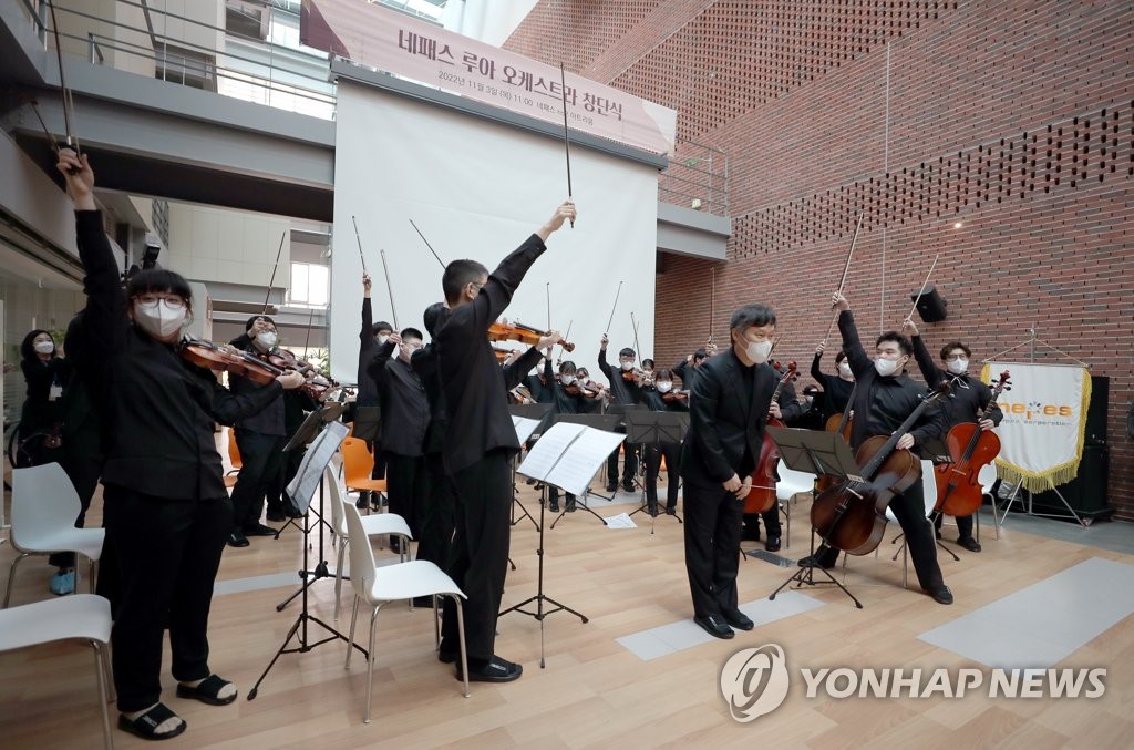 | ▲ 충북 최초 장애인 음악단 루아 오케스트라 창설 공연 (청주=연합뉴스) 김형우 기자 = 충북에서 최초로 만들어진 장애인 음악단 네패스 '루아 체임버 오케스트라'의 창설 첫 공연이 3일 오전 청주시 청원구 오창읍 오창산업단지 내 네패스 제2공장 아트리움에서 열렸다. 사진은 공연을 펼치고 있는 단원들의 모습. 2022.11.3 vodcast@yna.co.kr |