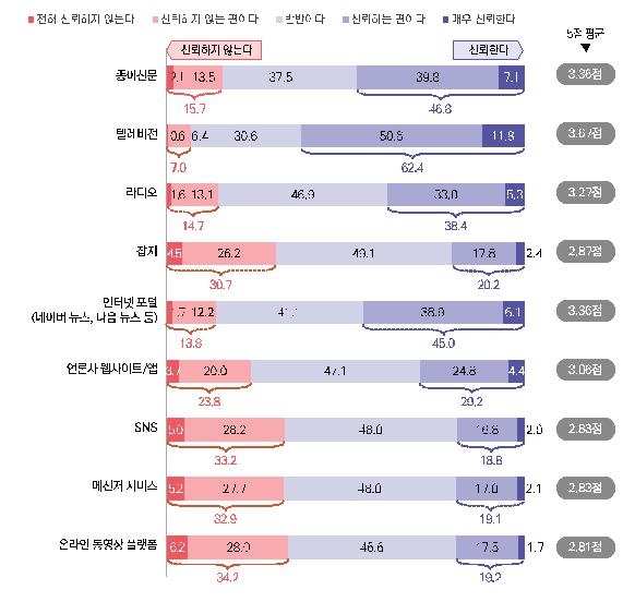 그러나 뉴스 신뢰도는 텔레비전이 5점 척도 평균 3.67점으로 가장 높았으며 종이신문(3.36점), 라디오(3.27점) 등 전통매체가 대체로 높았다.