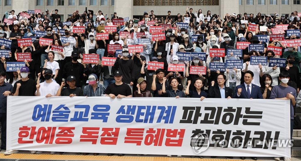 | ▲ 국회 앞 예술대 학생들 (서울=연합뉴스) 한상균 기자 = 전국예술대학총학생연합회가 30일 국회 본관 앞에서 한예종 특혜법 규탄대회를 하고 있다. 한국예술종합학교에 석·박사 학위 과정을 개설하는 법안 논의가 국회에서 본격화되자 예술대학들이 '특혜'라며 강하게 반발하고 나섰다. 2023.5.30 xyz@yna.co.kr |
