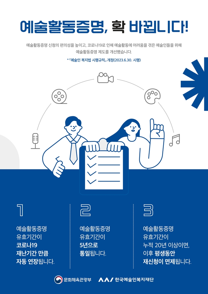 개정안에는 재난 기간만큼 예술활동증명 유효기간을 일괄 연장해주고, 20년 이상 예술활동증명을 유지한 예술인의 예술활동증명 재신청을 면제하는 내용이 담겼다.