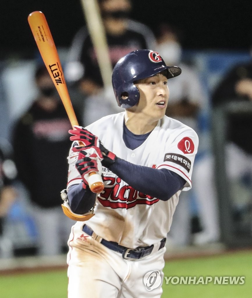 | ▲ In this file photo from Oct. 13, 2021, Son Ah-seop of the Lotte Giants hits an RBI single against the LG Twins in the bottom of the sixth inning of a Korea Baseball Organization regular season game at Sajik Baseball Stadium in Busan, some 450 kilometers southeast of Seoul. (Yonhap) |