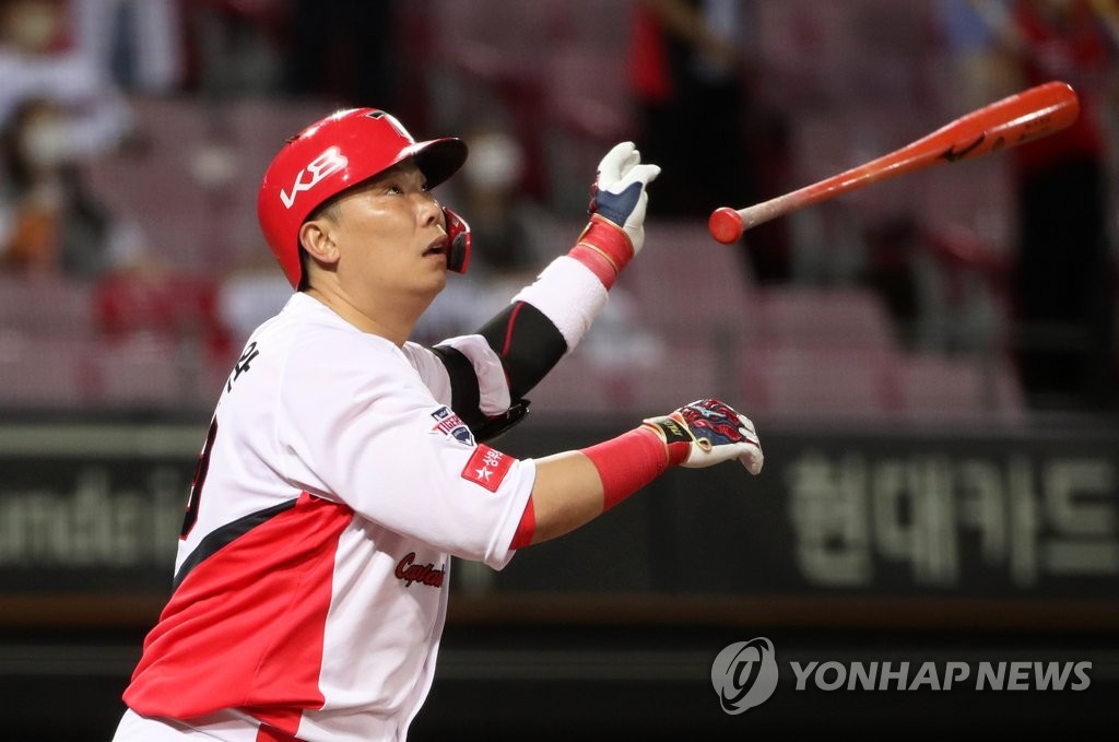 | ▲ In this file photo from Sept. 15, 2021, Na Ji-wan of the Kia Tigers tosses the bat after hitting a fly ball to right field against the Lotte Giants during the bottom of the fourth inning of a Korea Baseball Organization regular season game at Gwangju-Kia Champions Field in Gwangju, 270 kilometers south of Seoul. (Yonhap) |