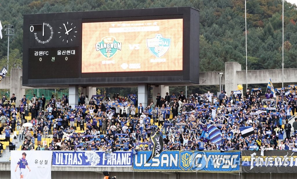 | ▲  Supporters for Ulsan Hyundai FC cheer on their K League 1 team during a match against Gangwon FC at Songam Sports Town in Chuncheon, 85 kilometers east of Seoul, on Oct. 16, 2022. (Yonhap) |