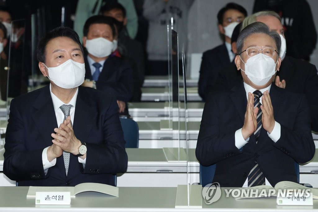 | ▲ This pool photo, taken Dec. 9, 2021, shows Lee Jae-myung, presidential candidate of the ruling Democratic Party (R) and Yoon Suk-yeol, presidential candidate of the main opposition People Power Party. (Yonhap) |