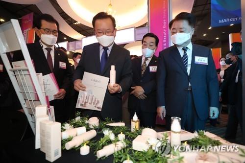 ▲ 화장품뷰티산업엑스포 찾은 김부겸 총리 (청주=연합뉴스) 김주형 기자 = 김부겸 국무총리(왼쪽 두 번째)가 19일 오후 충북 청주시 오송역에서 열린 화장품뷰티산업엑스포 개막식 행사를 마친 뒤 전시 부스를 둘러보고 있다. 2021.10.19 kjhpress@yna.co.kr