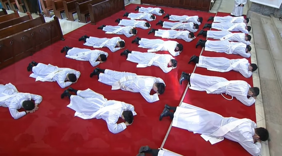이어 예비 사제들이 제대 앞에 엎드리는 부복(俯伏) 자세를 취하며 십자가를 향해 경배를 드리자, 정 대주교는 가톨릭 성인을 통해 바라는 바를 청하는 전구(轉求)를 올렸다.