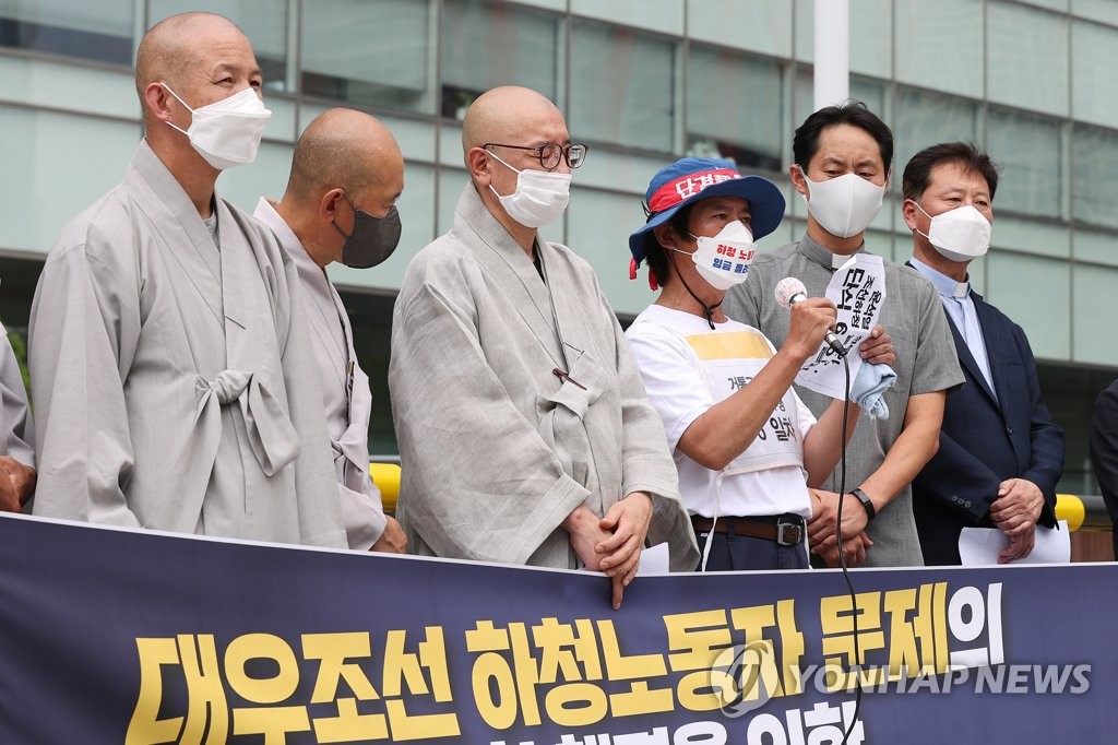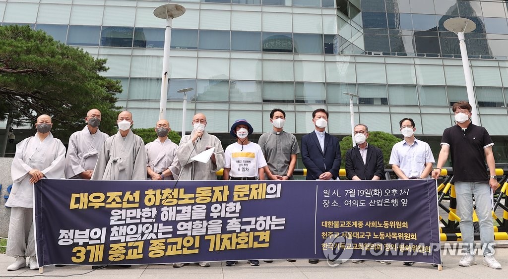 | ▲ 대우조선 하청노동자 문제 해결 위한 3개 종교 기자회견 (서울=연합뉴스) 신현우 기자 = 한국기독교교회협의회 정의평화위원회·천주교 서울대교구 노동사목위원회·대한불교조계종 사회노동위원회 관계자들이 19일 오후 서울 여의도 산업은행 본점 앞에서 대우조선 하청노동자 문제 해결에 정부가 책임 있는 자세로 나설 것을 촉구하고 있다. 2022.7.19 nowwego@yna.co.kr |
