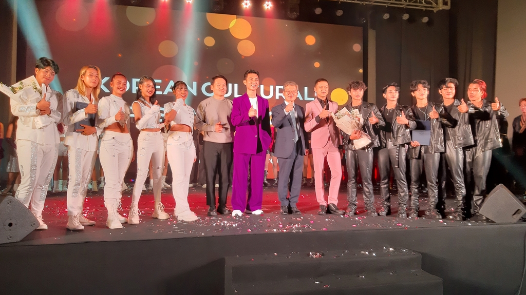 | ▲ 댄스 부문 1, 2위 시상팀, 심사위원들과 함께한 강금구 주미얀마 한국대사. (양곤=연합뉴스) 이정호 통신원 2023.07.22. |