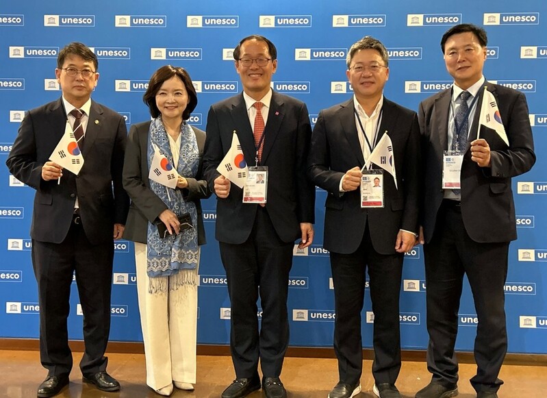 | ▲ 세계유산위원회, 내년에 부산서 열린다 (파리=연합뉴스) 김예나 기자 = 15일(현지시간) 프랑스 파리 유네스코 본부에서 열린 제47차 세계유산위원회에서 차기 위원회 개최국으로 대한민국이 확정됐다. 왼쪽부터 최응천 국가유산청장, 박상미 주유네스코 대표부 대사, 이준승 부산시 행정부시장, 국민의힘 박정하 의원, 더불어민주당 조계원 의원. 2025.7.15 yes@yna.co.kr |