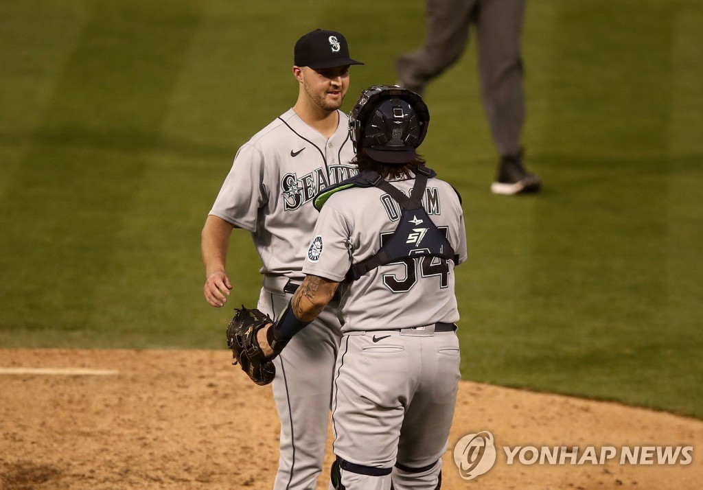 | ▲ In this Getty Images file photo from Sept. 26, 2020, Walker Lockett of the Seattle Mariners (L) celebrates with his catcher Joseph Odom after a 12-3 victory over the Oakland Athletics in a Major League Baseball regular season game at RingCentral Coliseum in Oakland. (Yonhap) |