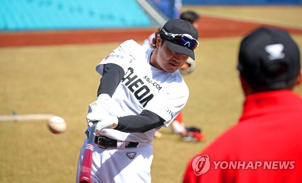 | ▲ Choo Shin-soo of the SSG Landers takes a batting practice before a spring training practice game against the Samsung Lions at Daegu Samsung Lions Park in Daegu, 300 kilometers southeast of Seoul, on March 16, 2021. (Yonhap) |